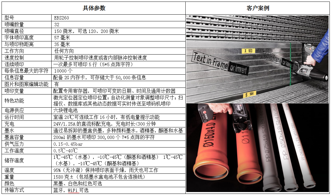 EBS260手持大字符噴碼機(jī)EBS 260 憑借其專利噴印技術(shù)取代了陳舊的手工標(biāo)識(如模具機(jī)、印花機(jī)、噴刷漆等,請工人操作時費(fèi)工時又效率低)