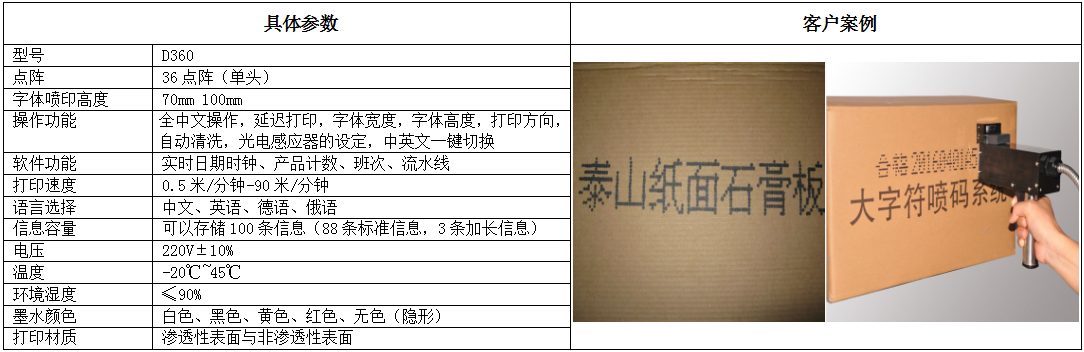 D360大字符噴碼機(jī)系統(tǒng) 外觀簡潔大方,加入了提手設(shè)計,更方便移動。密封式寶石噴頭堅固耐用,多種字型、字寬字高均可設(shè)置,并有延遲打印,自動清洗等功能。主要用于石膏板、紙卷、編織袋等初級包裝上噴碼,也可用于外包裝上噴印零售所需的產(chǎn)品圖片、條碼、商標(biāo)和貨運(yùn)信息。D360大字符噴碼機(jī)廣泛應(yīng)用于食品飲料、化工建材、醫(yī)藥、鋼鐵、系統(tǒng)集成、產(chǎn)品定制、配線生產(chǎn)等行業(yè)。